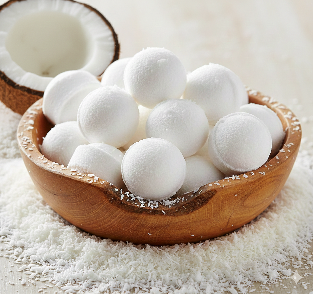 Mini effervescent au parfum doux et exotique de noix de coco, pour un bain relaxant et parfumé.