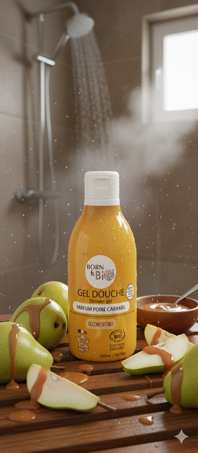 Gel douche au parfum gourmand de poire caramélisée, pour une ambiance douce et réconfortante sous la douche.