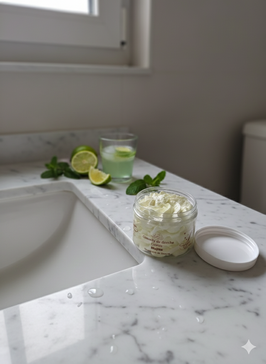 Transformez votre routine de soin en une expérience gourmande avec notre Chantilly de Douche et Bain au parfum irrésistible de mojito. Sa texture légère et onctueuse nettoie délicatement la peau, la laissant douce, hydratée et subtilement parfumée. Idéale pour une utilisation sous la douche ou dans le bain, elle offre un moment de pur plaisir sucré.