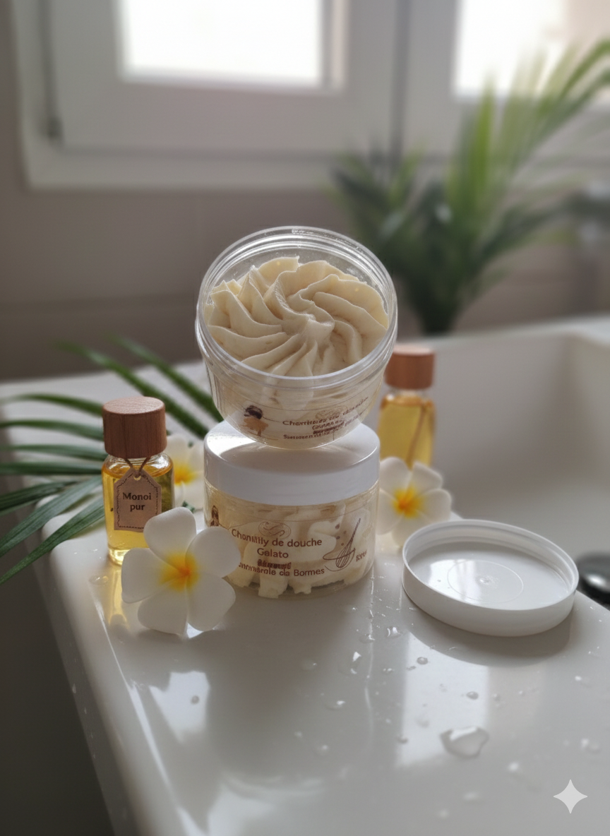 Transformez votre routine de soin en une expérience gourmande avec notre Chantilly de Douche et Bain au parfum irrésistible de monoï. Sa texture légère et onctueuse nettoie délicatement la peau, la laissant douce, hydratée et subtilement parfumée. Idéale pour une utilisation sous la douche ou dans le bain, elle offre un moment de pur plaisir sucré.