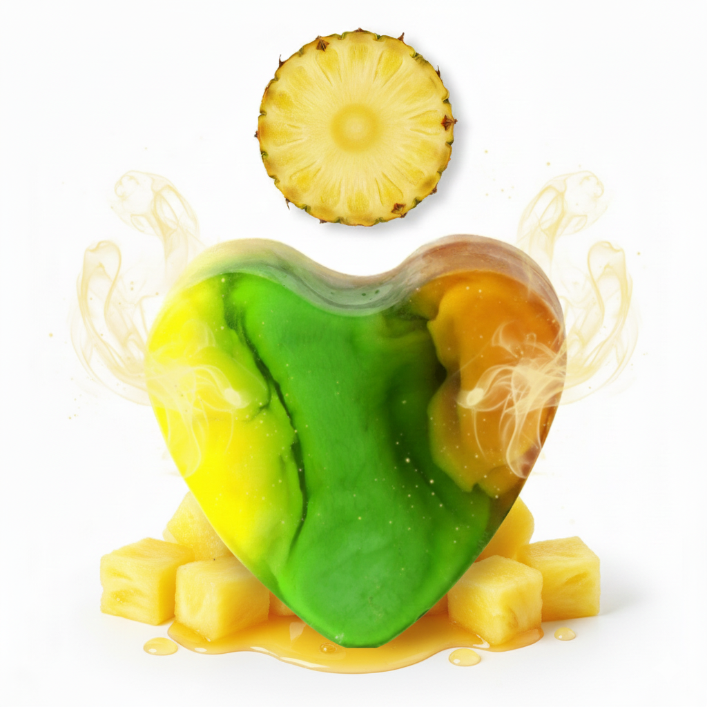 Savon à la glycérine en forme de cœur au parfum tropical et sucré d’ananas, pour une douche parfumée et hydratante.
