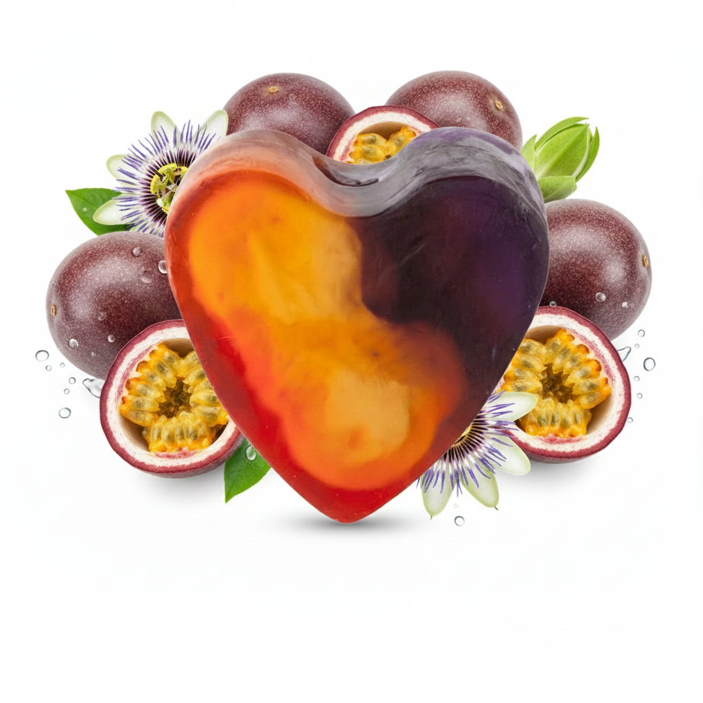 Savon à la glycérine en forme de cœur au parfum fruité et acidulé de fruit de la passion, pour une douche douce et parfumée qui laisse la peau hydratée et délicatement parfumée.
